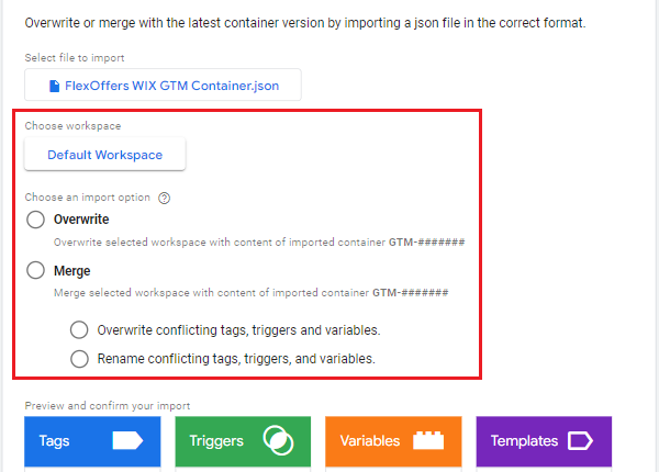 7. Choose your workspace and import options, and click the Confirm button. Note: Selecting the 'Overwrite' option may erase existing data in Google Tag Manager.