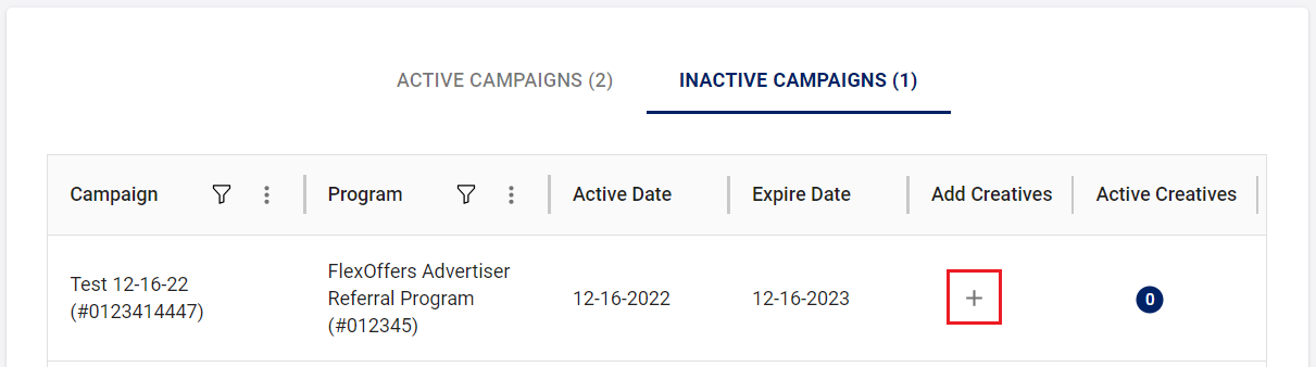 - Click the “+” sign under the Add Creatives column to add either a Text Link or Banner to your new campaign. Note: you need at least one creative before the campaign can be activated.
