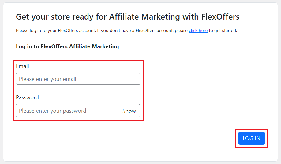 5. Enter the email address and password for your FlexOffers account and click the Log In button.